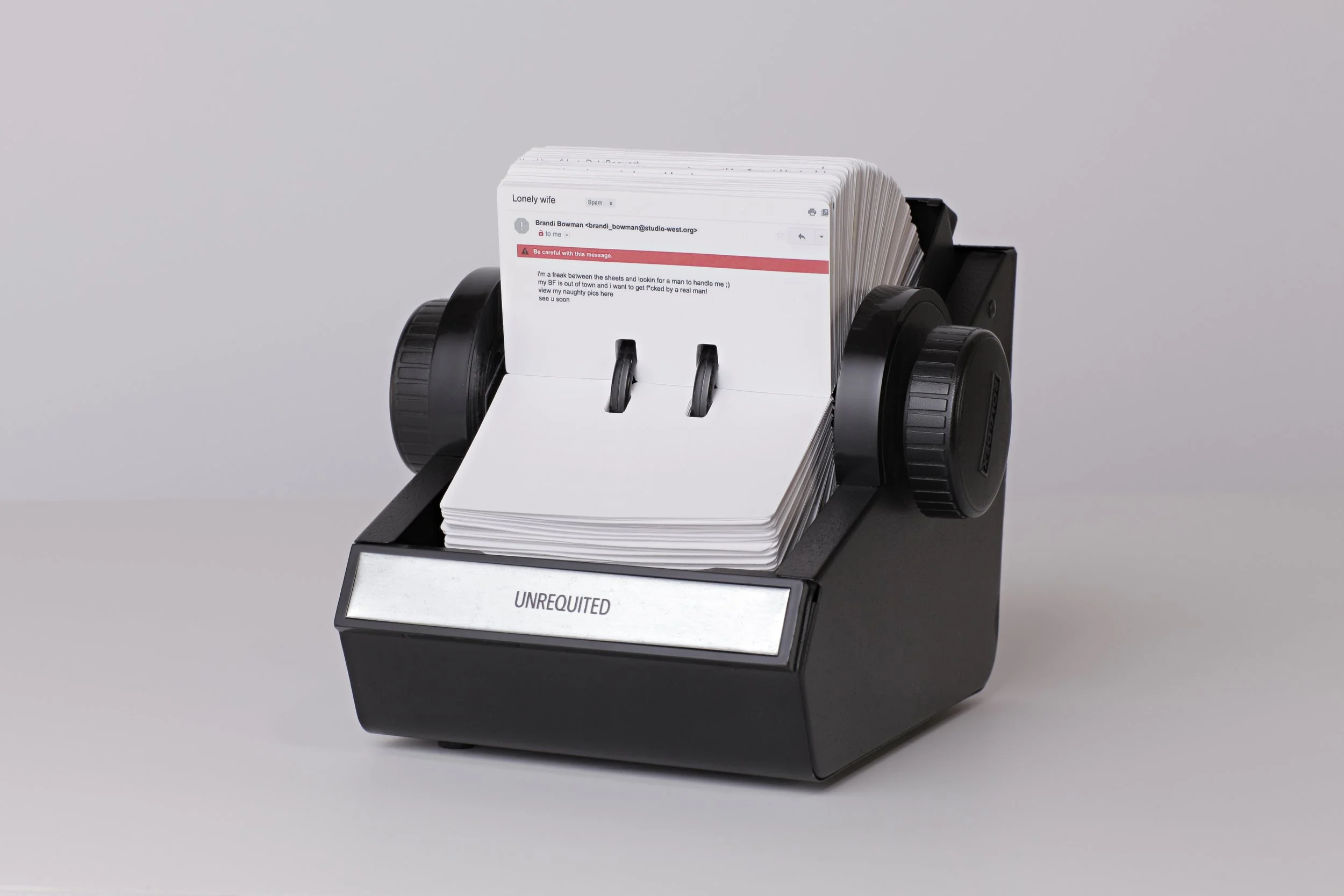 A burner gmail account amassed a few years' worth of spam emails. Over 400 of the most lascivious were resized onto card stock to fit inside a vintage Rolodex. Flip through scores of attempts to scam the unsuspecting with promises of love, overt sexuality and long distance friendship. And all in the broken English we've come to expect from Eastern Bloc phishing scammers. Sadly, none of these emails were responded to, so these empty offers of love and lust remain unrequited.